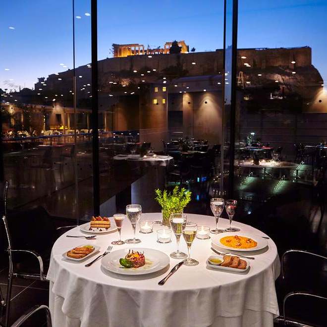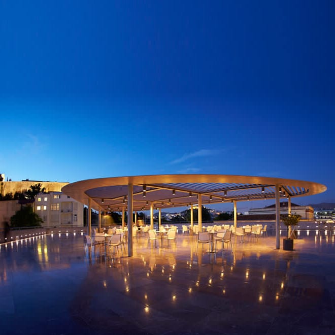 Set on the museum’s second floor, the restaurant features a spacious 700-square-meter dining area with panoramic views of the illuminated Acropolis and Athens' historic hills—creating a breathtaking backdrop for our gathering.